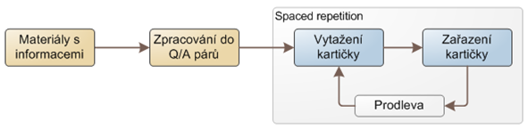 Obr. 7, Znázornění způsobu práce s kartičkovou metodou. Materiály je nutné zpracovat do Q/A párů. Poté co se kartička objeví v učení dojde k jejímu zařazení podle toho zda-li si člověk informaci na ní vybavil či nikoli.